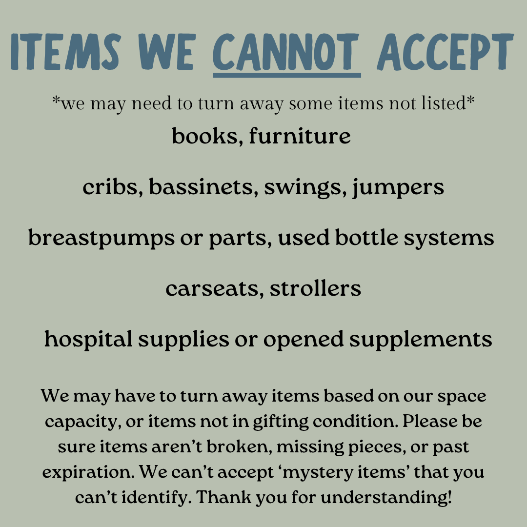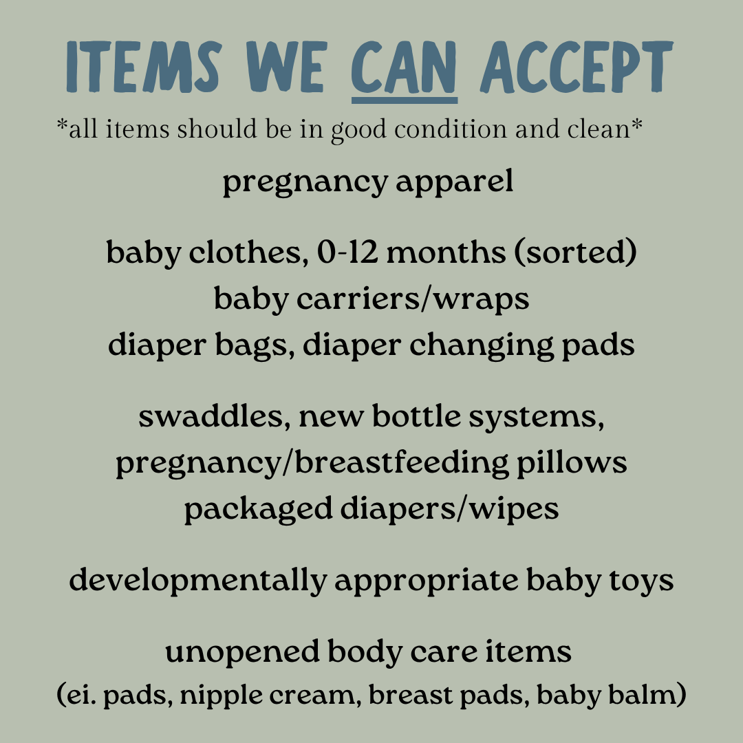 **Please SORT all clothes items by size (we accept pregnancy clothes and baby clothes 0-12 months) and be sure your gear items are organized and labeled so families understand what the item is. We cannot accept all items. There is a short list of items below to use as a guide.**